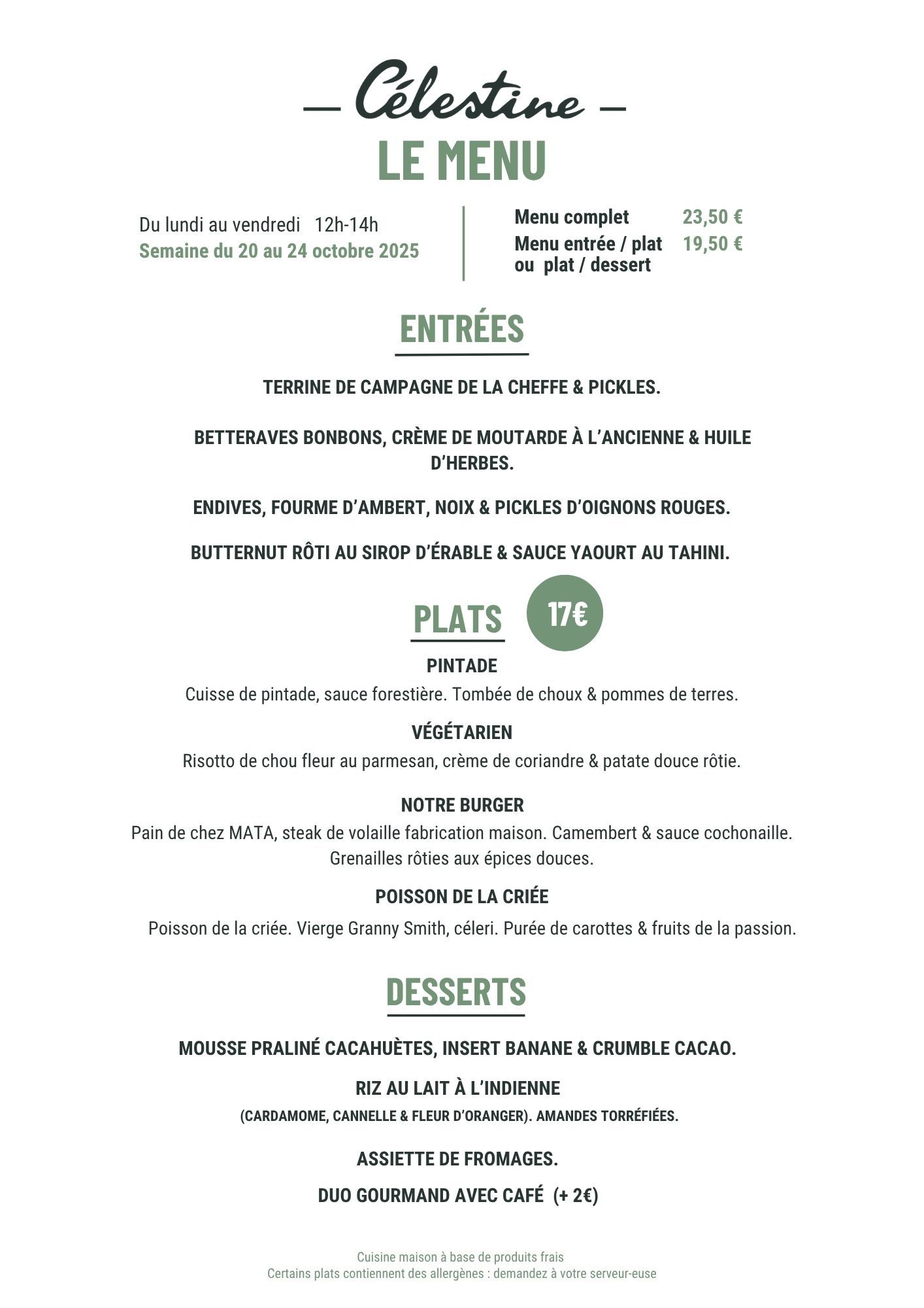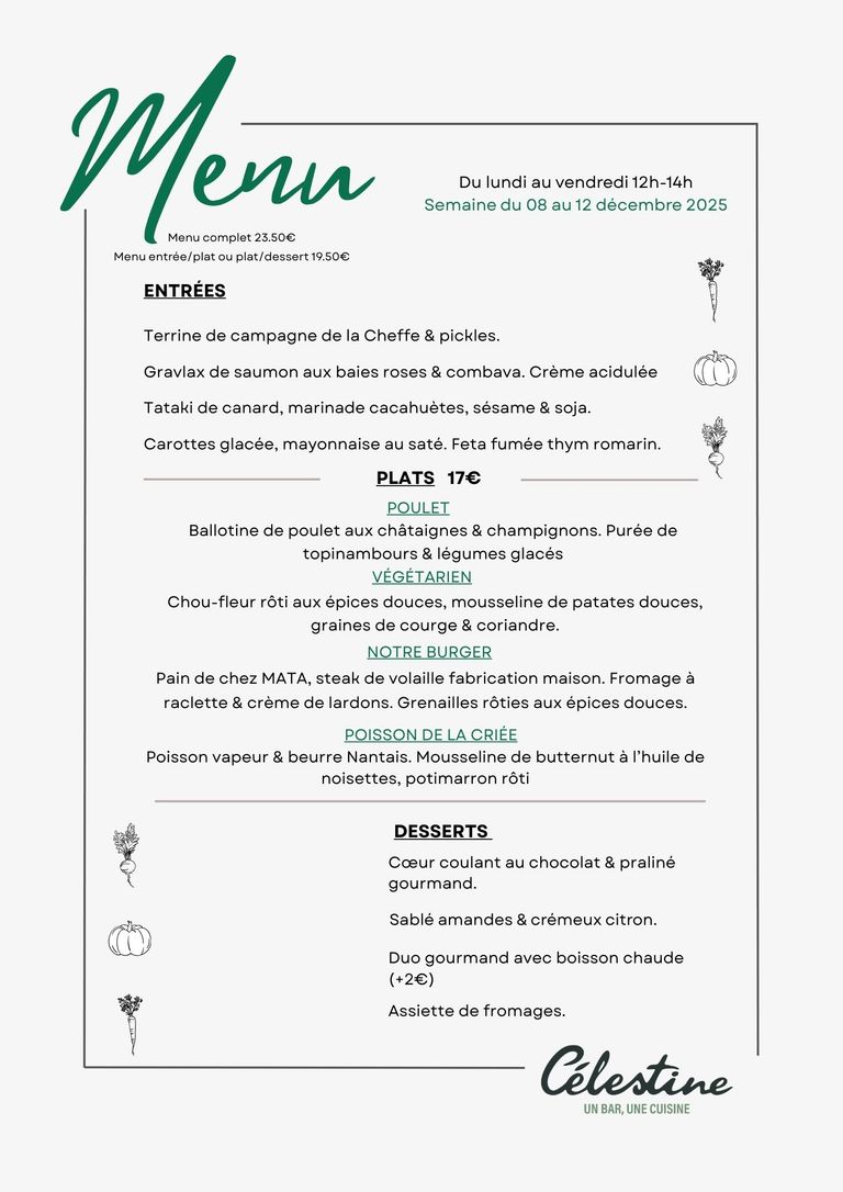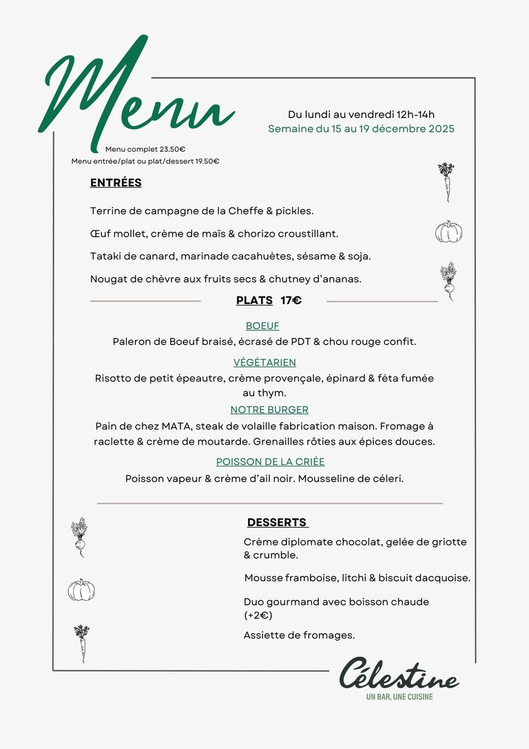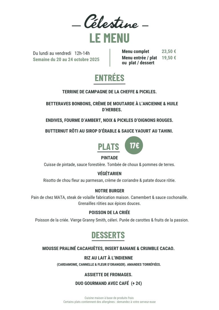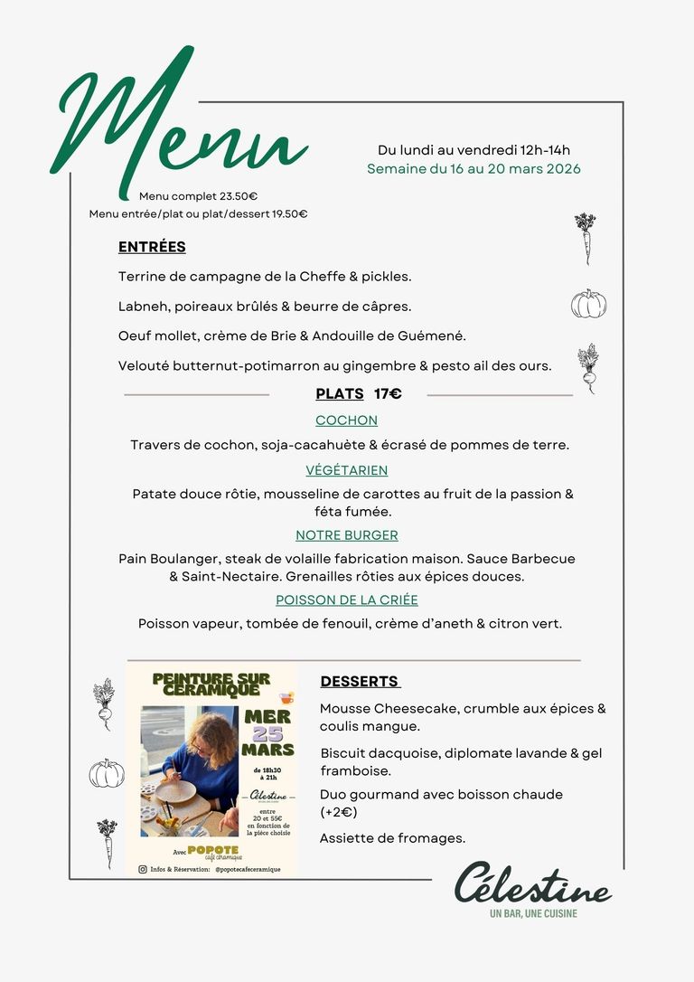 -Célestine- vous propose une carte qui change toutes les semaines avec toujours un poisson de la criée, notre burger et notre steak de volaille fabrication maison, un plat végétarien ...